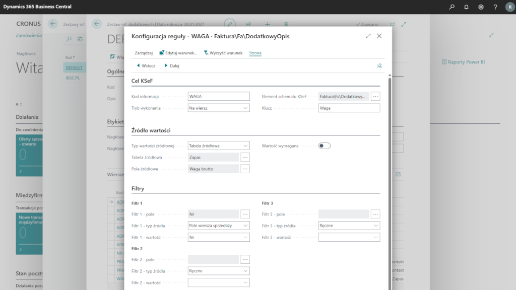 The solution can retrieve data from Business Central tables, which provides very broad possibilities for building additional information. It supports fixed values, source-table fields, and additional information stored for selected master data and documents. In practice, this means companies can use data available on records such as customer, vendor, item, resource, fixed asset, or G/L account, as well as on sales and service documents including orders, invoices, and credit memos.